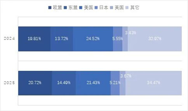 中国海关数据显示,2025年一至三季度,毛纺原料及制品进出口总额119亿美元(人民币金额855亿元),同比下跌2.3%。其中,毛纺原料及制品出口额92.2亿美元(人民币金额662亿元),同比增长1.6%,进口额26.9亿美元(人民币金额193亿元),同比下跌13.5%。 毛纺原料及制品出口目的地市场情况各有不同,1-9月,我国毛纺原料及制品出口欧盟出口额19.1亿美元,同比增长6.3%,出口东盟出口额13.4亿美元,同比增长7.3%,占毛纺原料及制品出口额的比重均有上升。向美国和日本出口的毛纺原料及制品出口额则呈现下滑,前三季度出口额分别为19.8亿美元和4.8亿美元,同比分别下跌11.2%和4.7%。