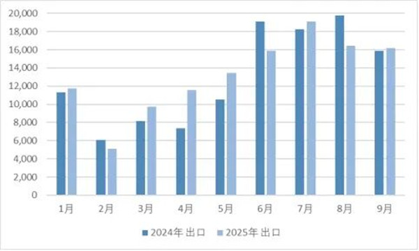 1-9月,羊绒原料及制品累计出口11.92亿美元,同比增长2.34%,出口规模整体实现稳步增长。从月度表现来看,9月单月出口额1.62 亿美元,同比增长1.63%。羊绒纱、羊绒衫及围巾等产品平均单价延续上行趋势,在有力拉动出口总额增长的同时,进一步强化了出口结构向高附加值方向优化的格局。 2024年-2025年羊绒原料及制品月度出口额变化情况(单位:万美元)