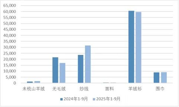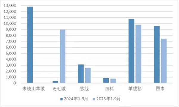 数据来源:中国海关 1、原料进口持续调整。无毛绒累计进口1702吨,进口金额8966.73万美元。 2、羊绒纱线累计进口223吨,进口金额2536.99万美元,同比分别下降13.20%、17.83%;与上年同期相比,平均单价减少5.34%。进口羊绒纱线量额同比双降且单价同步下滑,反映出国内下游需求或采购意愿有所减弱。 3、粗梳羊绒面料累计进口8.62万米,同比下降11.68%;进口金额743.84万美元,同比下降10.47%,显示粗梳羊绒面料进口规模持续收缩;平均单价同比微涨1.38%,价格保持相对稳定。 4、羊绒衫累计进口30.14万件,进口金额9780.34万美元,同比分别下降1.21%和9.27%。受欧盟进口量减少直接拉低整体平均单价影响,进口羊绒衫平均单价同比降幅8.16%,这也从一个侧面反映出国内市场对进口羊绒衫的采购需求与价格接受度均有所回落。 5、羊绒围巾累计进口22.81万条,进口金额7437.44万美元,同比分别下降27.67%、22.32%;平均单价同比提升7.39%,延续了国内进口需求减少,高单价、高品质羊绒围巾采购倾向持续的特点。 羊绒各品类1-9月累计进口额变化情况(单位:万美元)