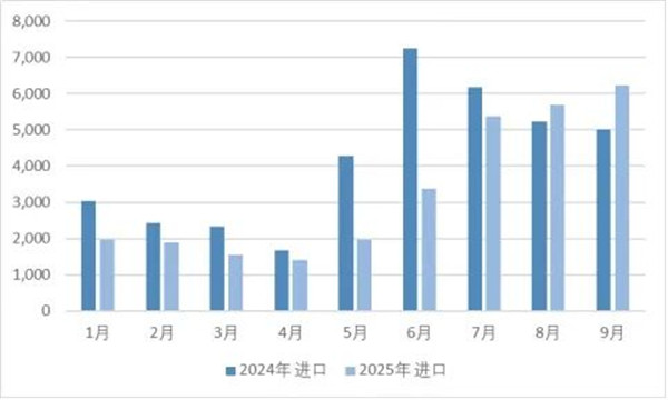 1-9月,羊绒原料及制品进口总额为2.95亿美元,同比大幅下降21.32%。除无毛绒因调整推动进口增长外,其余品类进口量额均呈下滑趋势,整体进口规模持续收缩。 2024年-2025年羊绒原料及制品月度进口额变化情况(单位:万美元)