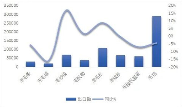 2025年前10个月,毛纺原料与制品的进出口趋势平稳,需求结构有所变化。根据中国海关数据,1-10月,毛纺原料进出口总额133亿美元(人民币金额954亿元),同比下跌2.5%。其中,毛纺原料及制品出口额102.7亿美元(人民币金额737亿元),同比下跌0.3%,进口额30.3亿美元(人民币金额217亿元),同比下跌11.1%。 毛纺原料与初加工产品出口的跌幅较上半年有明显回调,其中,羊毛条出口3.7万吨,同比下跌1.8%,跌幅较上半年回调5.6个百分点;出口额3.1亿美元,同比下跌5.6%,跌幅较上半年回调8.4个百分点。无毛绒出口2081吨,同比下跌15%,跌幅较上半年回调11个百分点;出口额2.0亿美元,同比下跌16.1%,较上半年回调8.8个百分点。 毛纺中间与成品出口形势较上半年则呈现一定回落。毛纱线出口2.7万吨,同比增长10%,增速较上半年下调2.5个百分点;出口额7.1亿美元,同比增长17%,增速较上半年下滑1.8个百分点。羊毛衫出口6387万件,同比增长13.7%,增速较上半年减少13.8个百分点;出口额10.9亿美元,同比增长8.8%,增速较上半年下滑9.6个百分点。毛梭织服装出口1528万件,同比下跌0.7%,较上半年回落11.3个百分点;出口额6.3亿美元,同比下跌7%,跌幅较上半年扩大3.7个百分点。