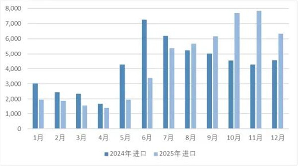 2025年,羊绒原料及制品进口呈现“前低后高”的明显走势,与2024年“年中高位”的节奏形成鲜明对比,反映市场需求周期的变化特征。 2024年-2025年羊绒原料及制品月度进口额变化情况(单位:万美元)