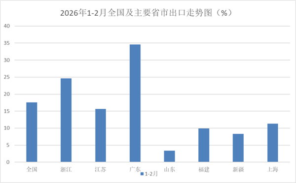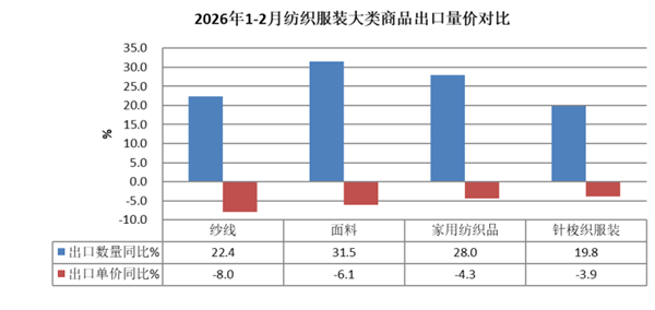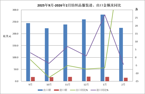 2026年1-2月,全国货物贸易进出口总值10995.4亿美元,同比(下同)增长21%,其中出口6565.8亿美元,增长21.8%,进口4429.6亿美元,增长19.8%,累计贸易顺差2136.2亿美元。 1-2月,纺织品服装贸易额537.4亿美元,同比增长17.2%,其中出口504.5亿美元,增长17.6%,进口33亿美元,增长10.7%,累计贸易顺差471.5亿美元,增长18.2%。