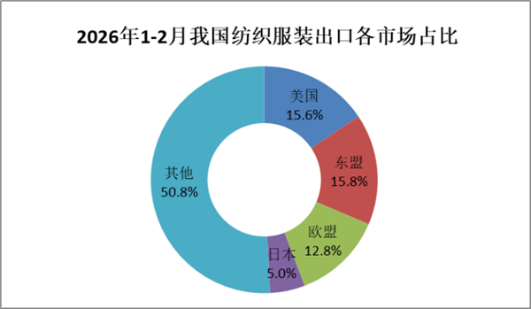 2026年1-2月纺织品服装贸易呈现如下特点: 一、对四大传统市场出口均增长,对“一带一路”共建国家出口增长超20% 1-2月,我对美国、东盟、欧盟和日本纺织服装出口分别增长9.7%、19.1%、16.2%和7.9%。我对上述四大传统市场合计出口248.3亿美元,占我出口总额的49.2%。对“一带一路”共建国家出口额为290.5亿美元,同比增长20.8%,占总体出口的57.6%。