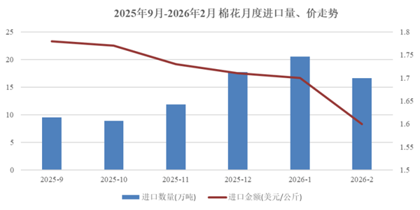 四、面料进口金额、价格下降,针梭织服装进口单价上涨 1-2月,纺织服装累计进口额33.0亿美元,同比增长10.7%。其中纺织品进口15.9亿美元,增长12.2%,服装进口17.1亿美元,增长9.4%。大类商品中,纱线累计进口额增长26.9%,进口量增长31.9%,单价同比下降3.7%。面料进口额同比下降8.9%,进口量持平,单价同比下降8.9%。针梭织服装进口额增长9.1%,进口量微增0.2%,单价上升8.9%。 五、多因素促棉花消费增长,增发配额缓解供给压力 根据中国棉花协会发布的信息,2月,春节假期后纺织企业有序复工复产,纱线产销顺畅,棉花采购需求逐步回升,加之宏观预期改善以及新疆植棉面积调减,市场预期未来供求偏紧,支撑国内棉价持续走高,国际价格虽有所回升,但涨幅不及国内,内外棉价差达到近年新高,纺织企业面临较大竞争压力。为保障纺织企业需求,国家有关部门于3月初增发棉花进口滑准税加工贸易配额30万吨,有望缓解国内供给压力。 据海关总署数据,2月我国进口棉花16.6万吨,环比下降18.9%,同比增长44%。主要来源国以巴西为主,占比为71.4%,澳大利亚、美国分别占7.6%和5.1%。2026年前2个月累计进口棉花37.2万吨,同比增长41%。 1-2月,化学纤维累计进口量下降27.7%,进口均价增长7.7%。